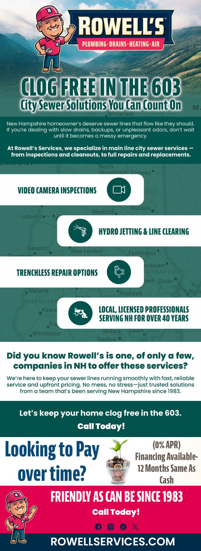 We're here to keep your sewer lines running smoothly with fast, reliable service and upfront pricing. No mess, no stress—just trusted solutions from a team that's been serving Bow since 1983.