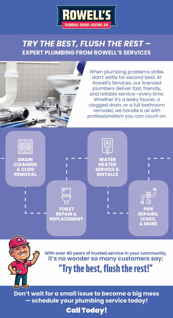When plumbing problems strike, don't settle for second best. At Rowell's Services, our licensed plumbers deliver fast, friendly, and reliable service—every time. Whether it's a leaky faucet, a clogged drain, or a full bathroom remodel, we handle it all with professionalism you can count on.